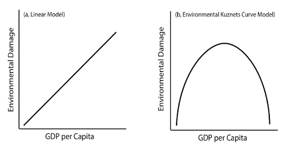 Now we can get to the real point of this article, which I will pose as a hypothetical question: What if instead of environmental damage always increasing as people get richer, it reaches a tipping point somewhere along our development, thereafter actually going down as we continue to develop even further? In other words, what if when we graph our impacts on the world around us, instead of a linear model like graph A shown below, it actually looks parabolic like graph B?