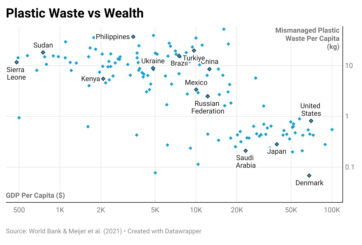 Take note of the logarithmic scales on the chart. The plastic waste figures comes from a 2021 study, while the GDP per capita figures come from the World Bank.